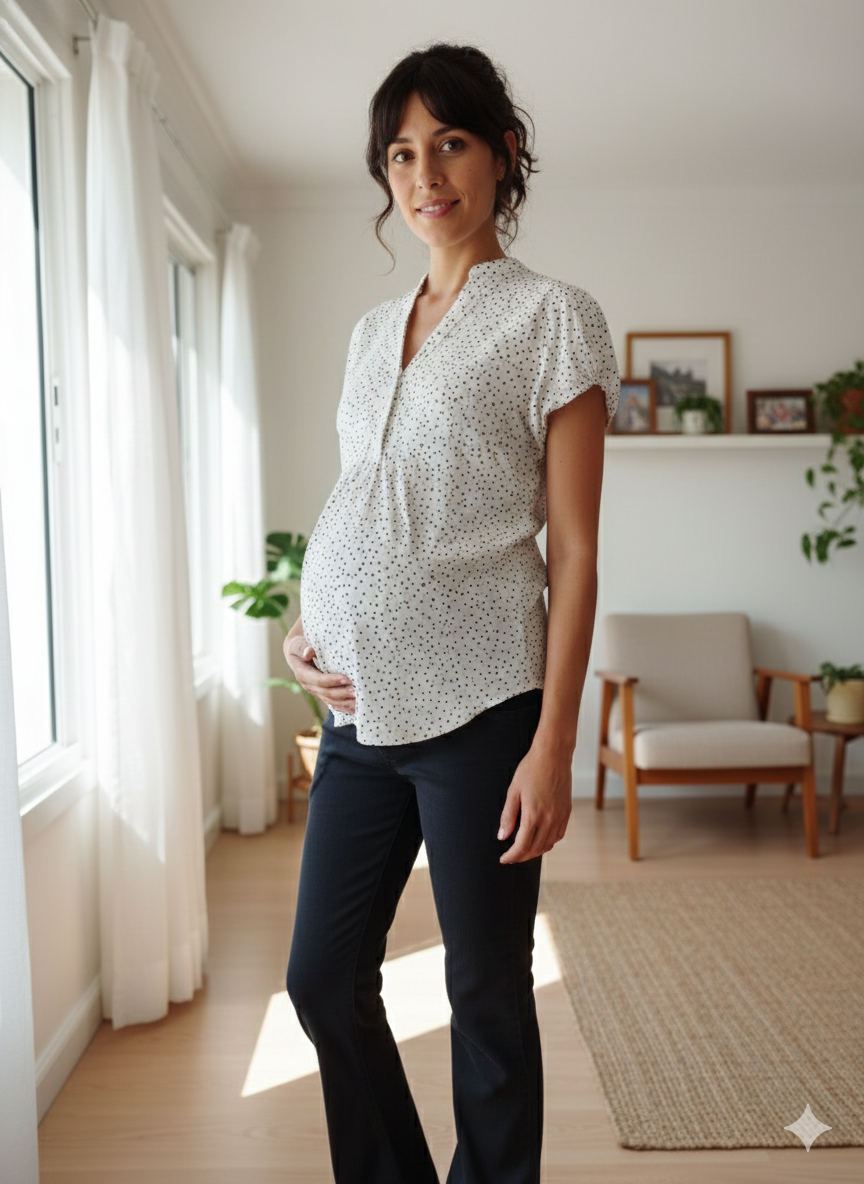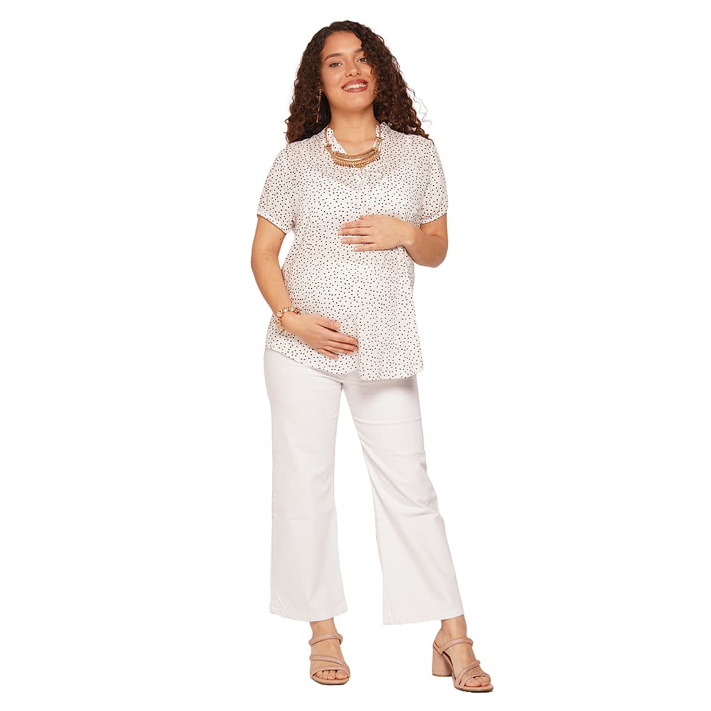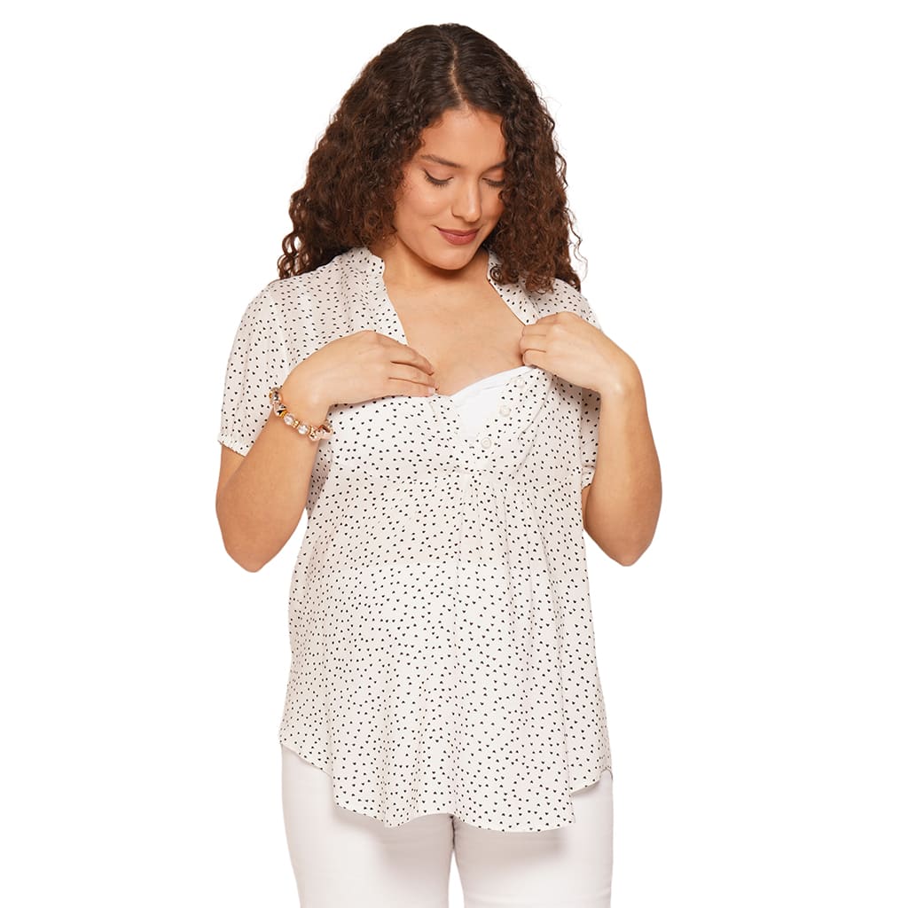 Camisola con delicada estampa corazones fresca y comoda para usar durante el embarazo y la lactancia. Calce Regular con frunce en bajo busto y botones en frente para una discreta lactancia. Ideal para un look mas formal o para un dia de oficina
