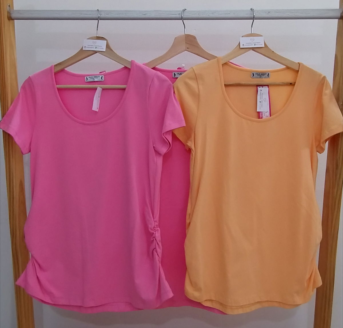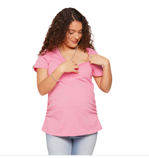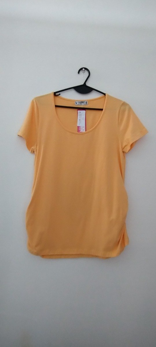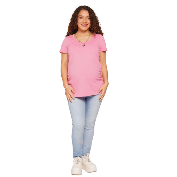 Remera cuello redondo confecciónada en algodón con lycra que te permite estar cómoda durante todo el día. Ideal para usar durante el embarazo con sus detalles de frunces que marcan la pancita.