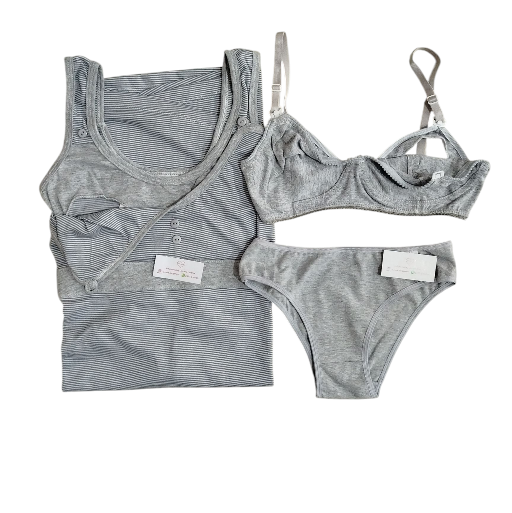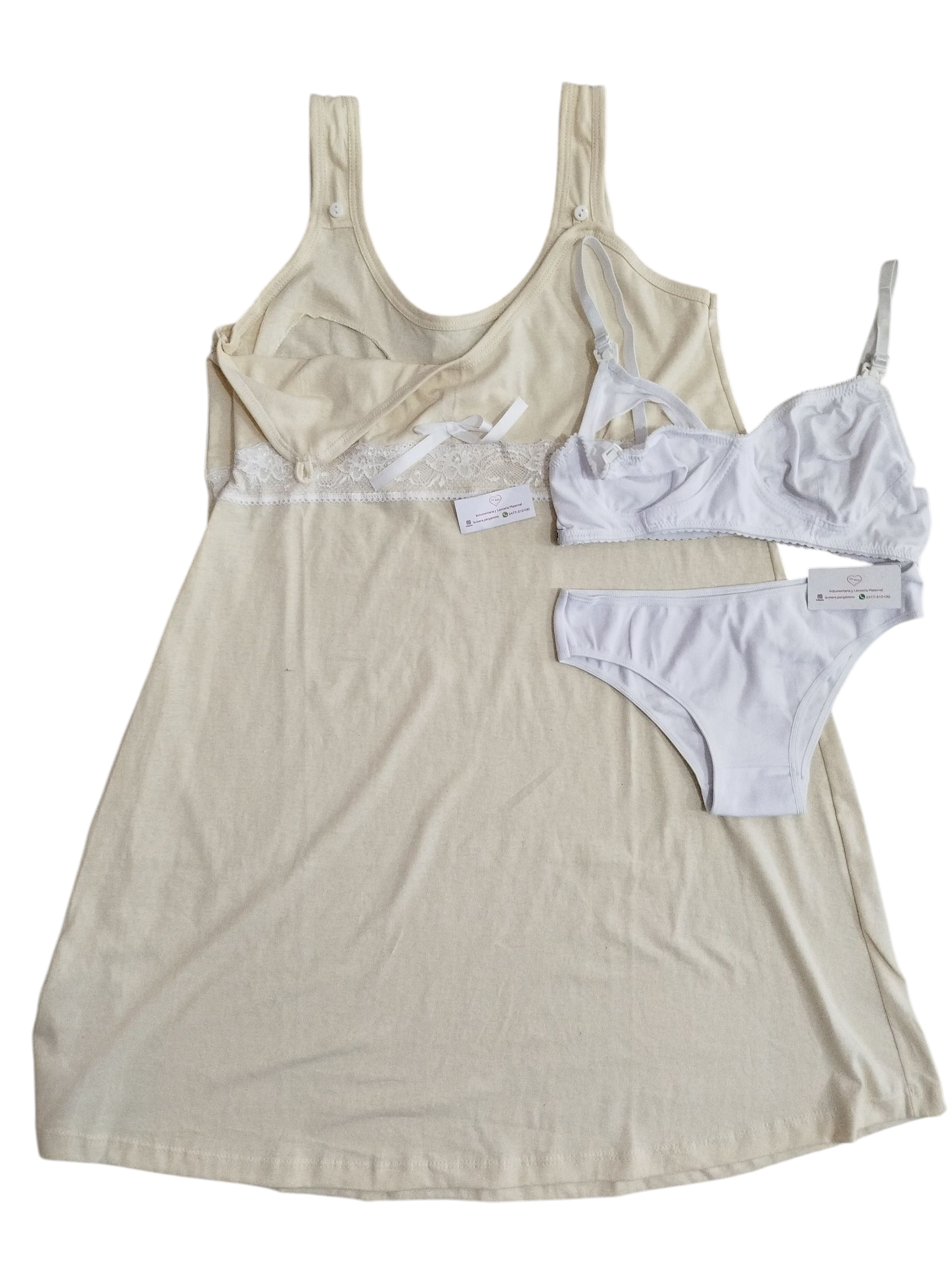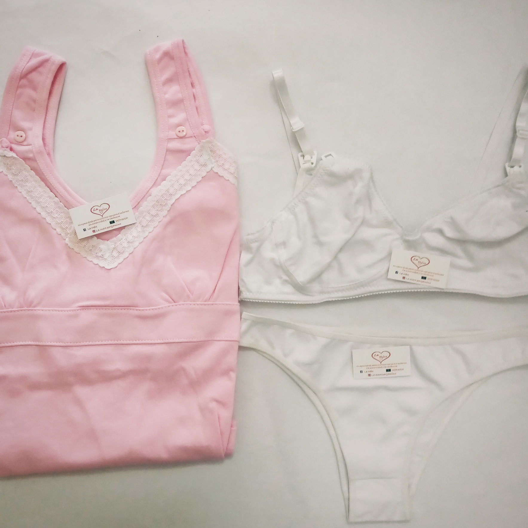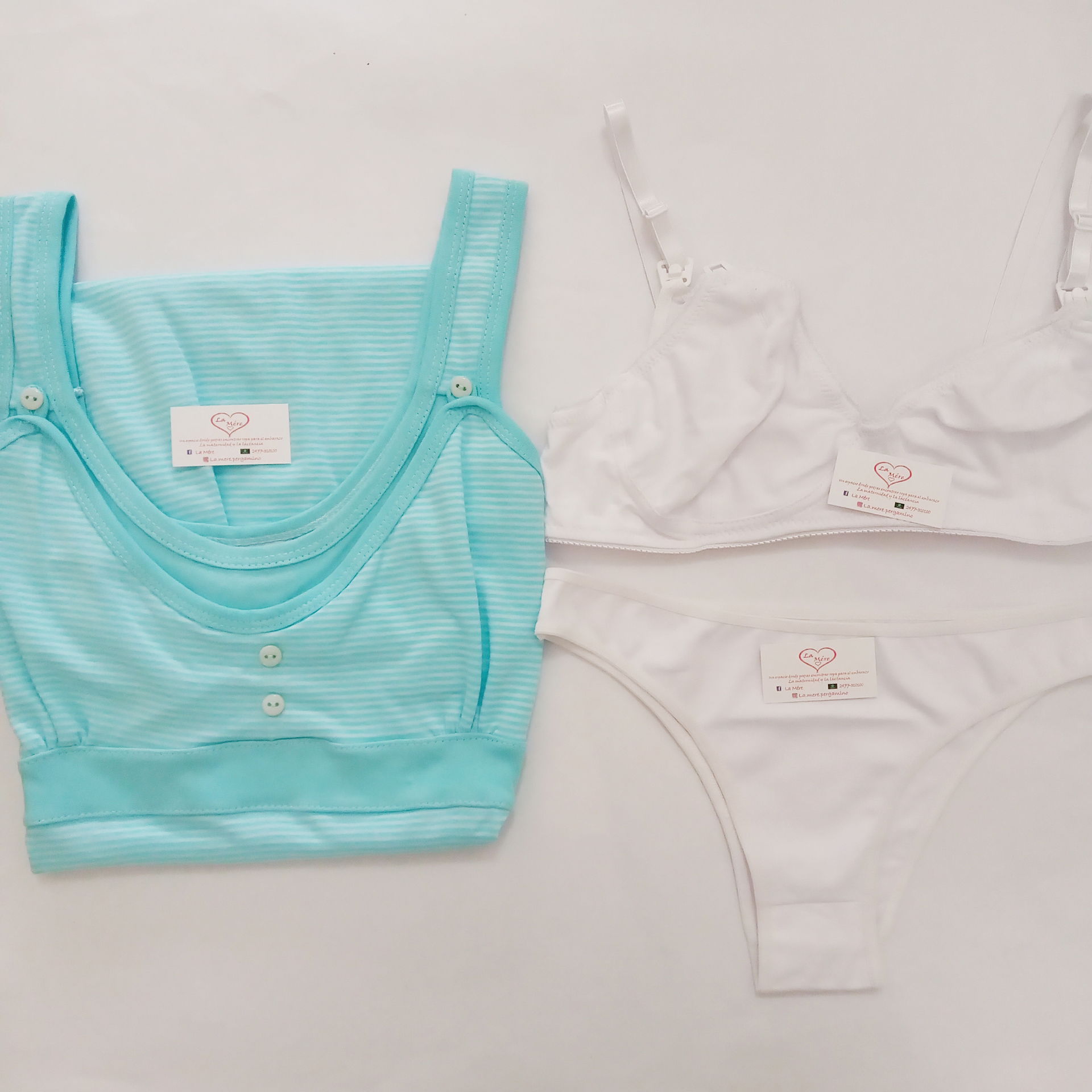 Incluye un conjunto de ropa interior maternal. El corpiño de taza doble con broche desmontable para amamantar y breteles finos regulables. y una vedetina