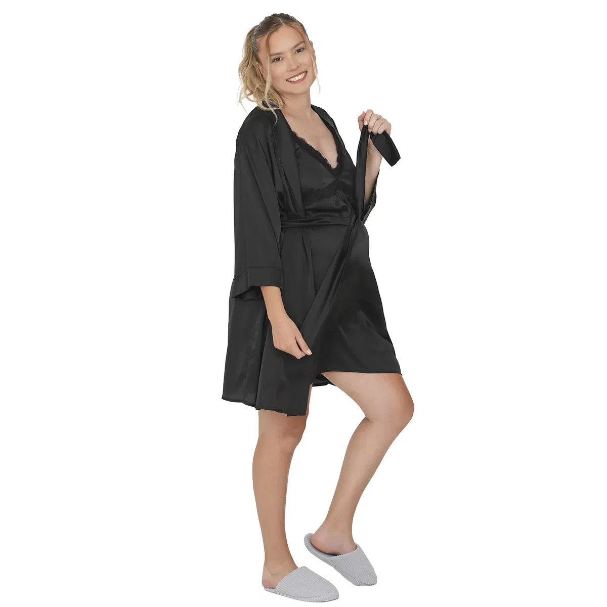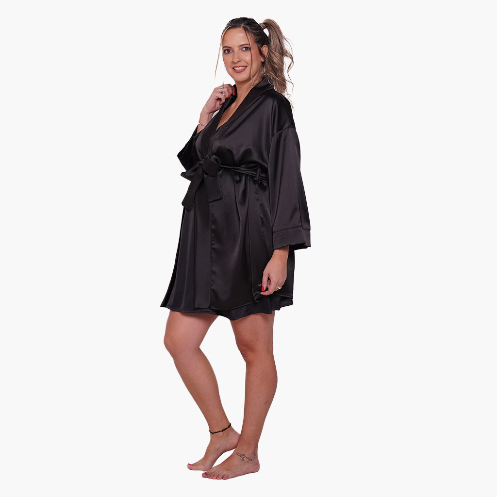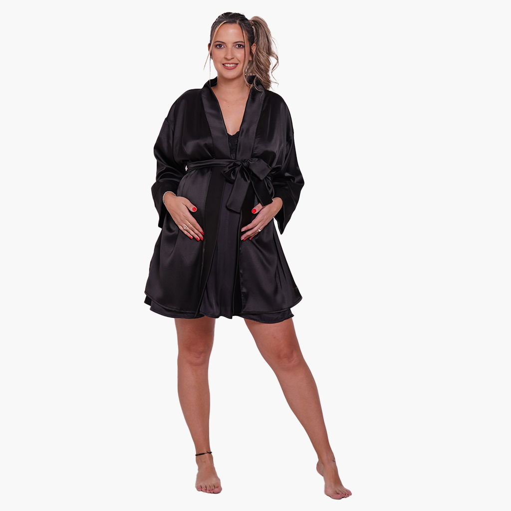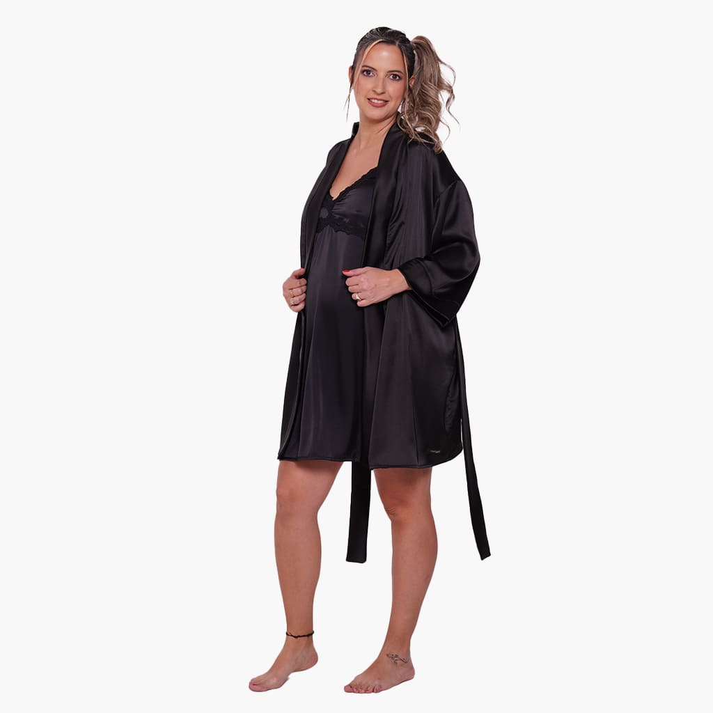 Disfruta de esta bata de corte amplio, mangas 3/4, con lazo para ajustar a la cintura. Ideal para usar en Conjunto con el Camisón Maternal Paris.
