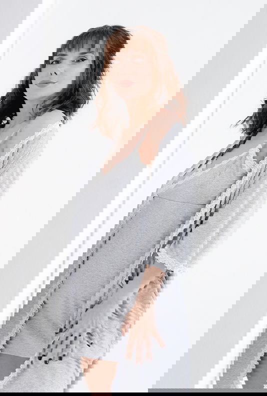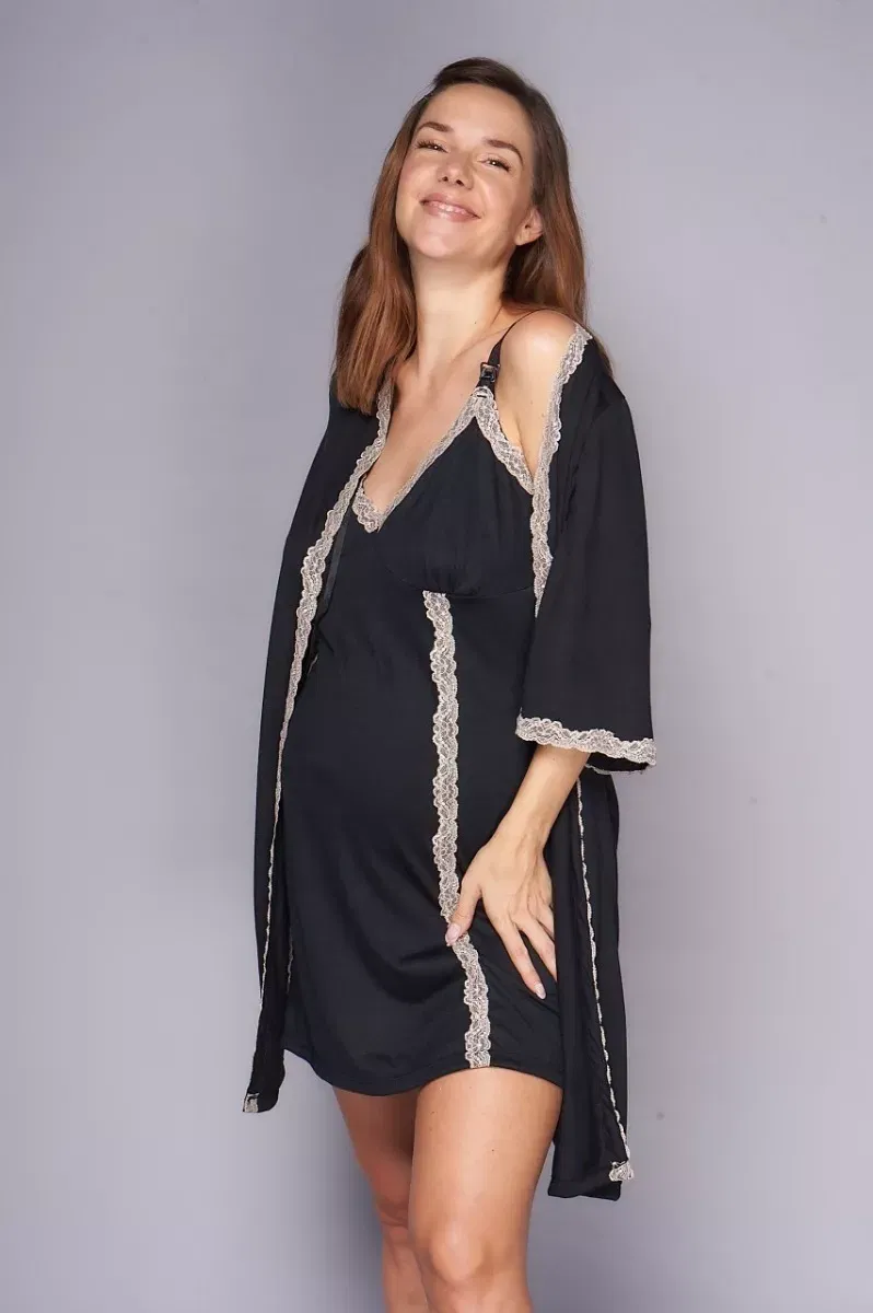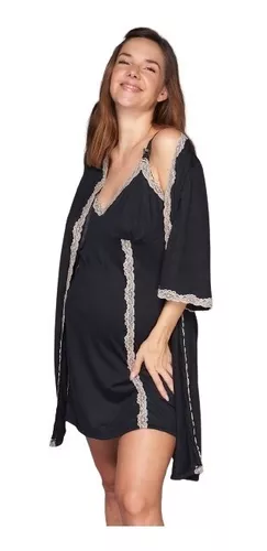 Elegancia y confort se combinan en esta bata con mangas 3/4 y delicados detalles de puntilla. Su suave tejido de gran caida es ideal para los momentos de descanso y lactancia.