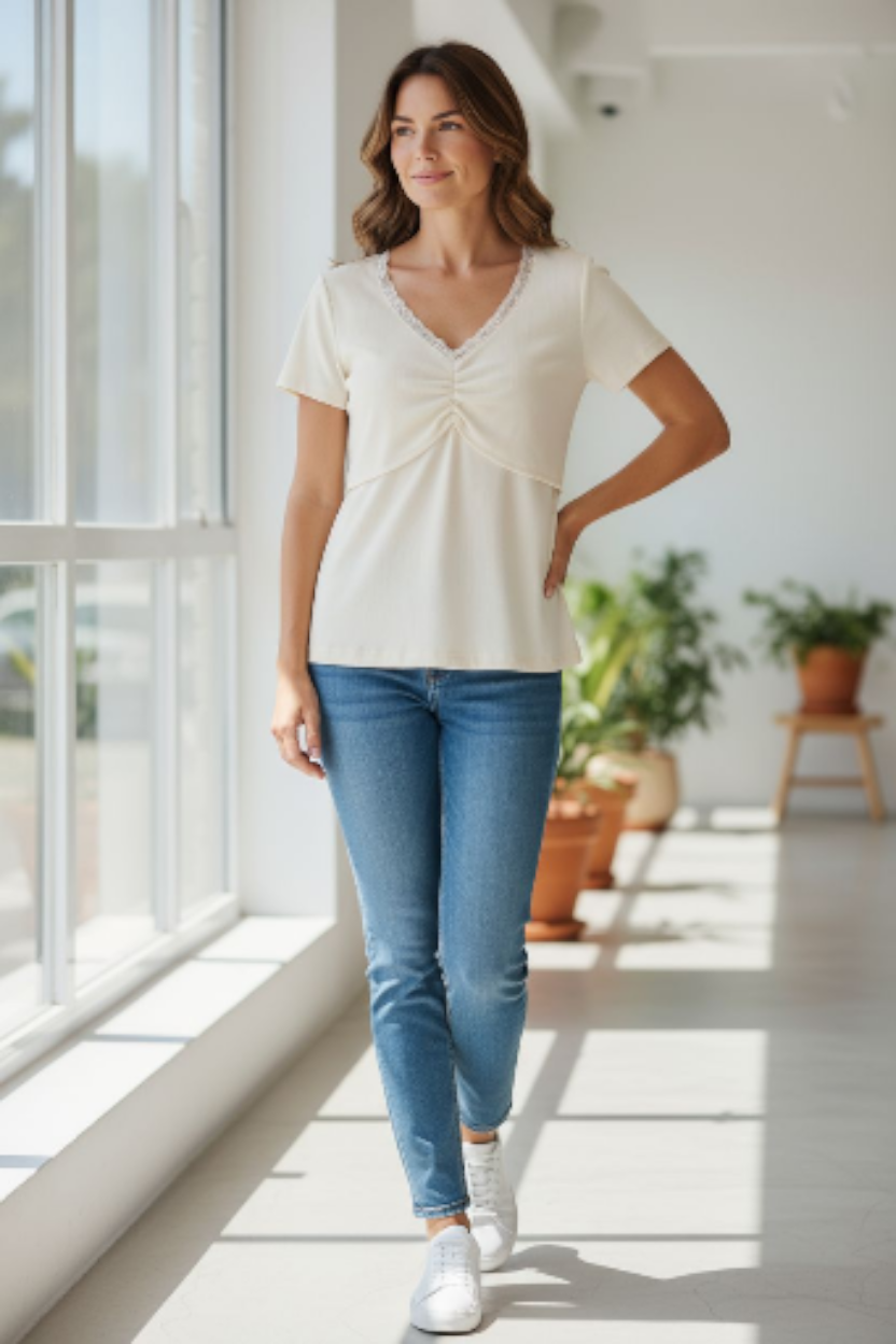 La puntilla en el diseño añade un toque femenino y delicado, haciendo que esta remera sea perfecta para combinar con diferentes estilos. Ya sea para un día en casa o una salida casual, esta prenda se convierte en un básico esencial en el guardarropa de cualquier madre.